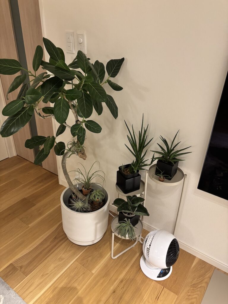 ちなみに観葉植物も置いていて、パキラ、パンダガジュマル、フィカスエラスティカ系とか乾燥に強いタイプなどは全然平気でした。(ただし水あげの頻度は上がります)