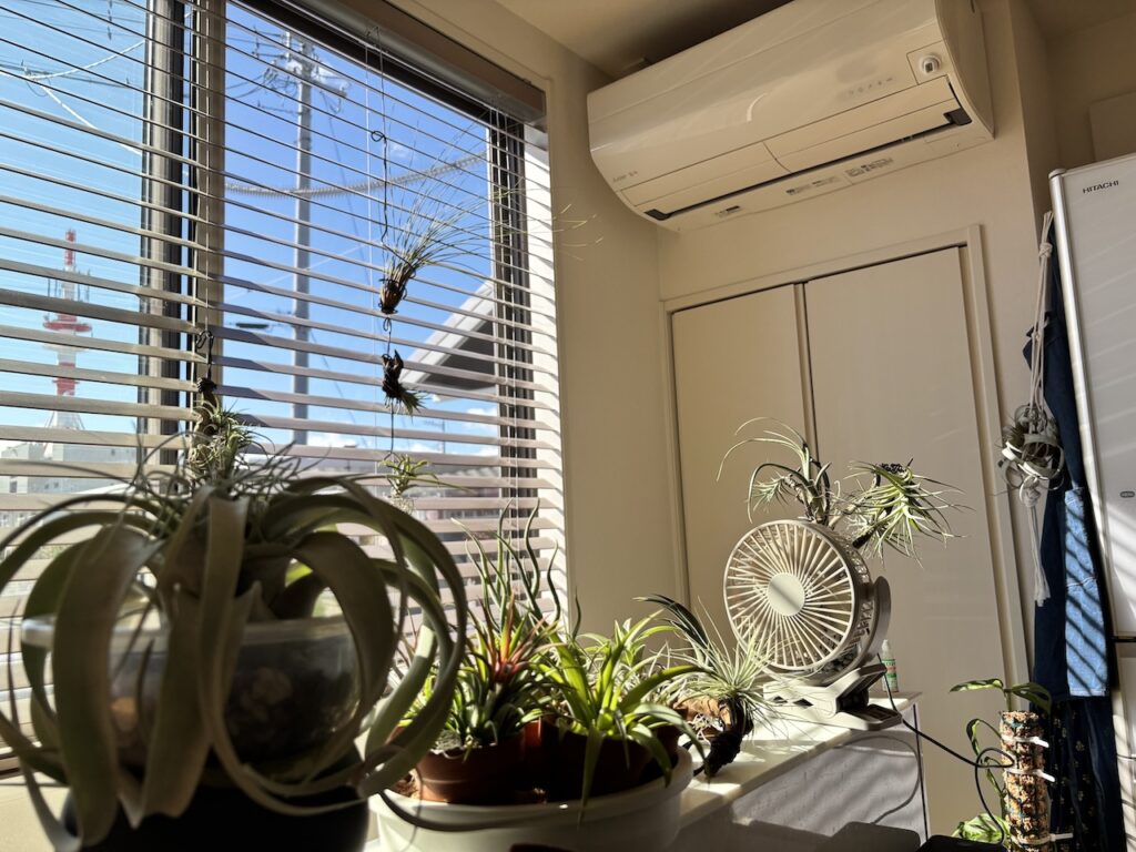 私の経験ですが、エアコンの直風が当たる場所でも葉幅の広いティランジアはピンピンしていました。