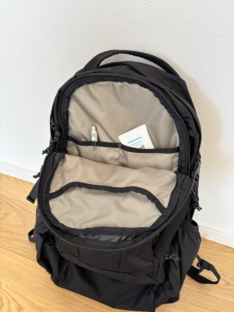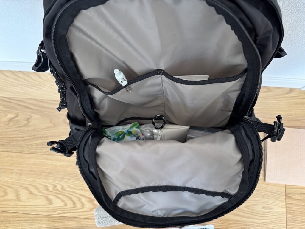 バックの正面から見て右側には縦ジッパーを開けるとちょっとした収納があります。