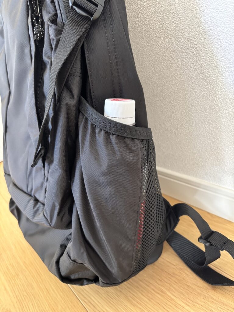 両サイドには、サイドポケットがついており、ペットボトルや折りたたみ傘が収納できます。