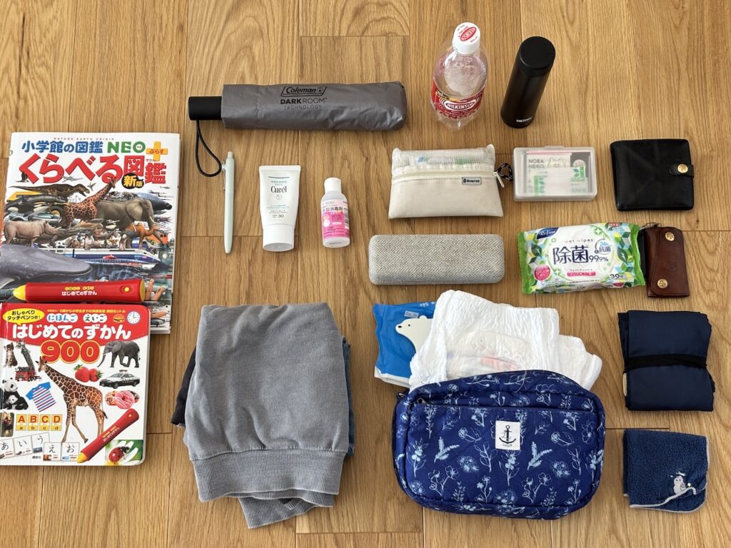 財布、車・自宅の鍵、エコバック、ハンカチ、ピルケース、除菌シート、オムツ・おしり拭きセット、水筒、ペットボトル、救急セット、メガネ・サングラスケース、折りたたみ傘、消毒用アルコール、日焼け止め、ペン、次男着替えセット、暇つぶし用の本2冊(長男・次男1冊ずつ)