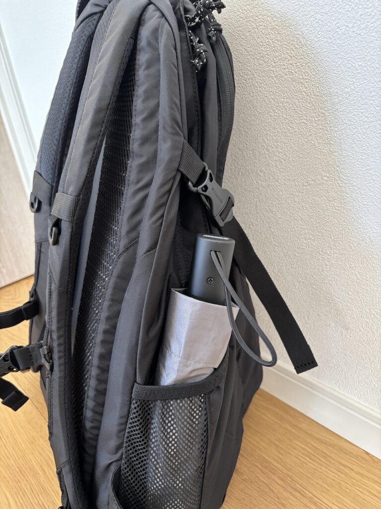 ・本体右側面に小型の折りたたみ傘なども収納できるファスナーポケット