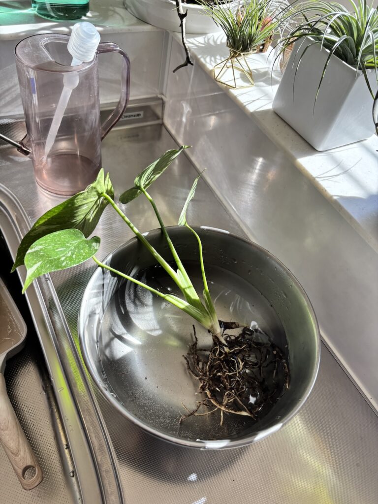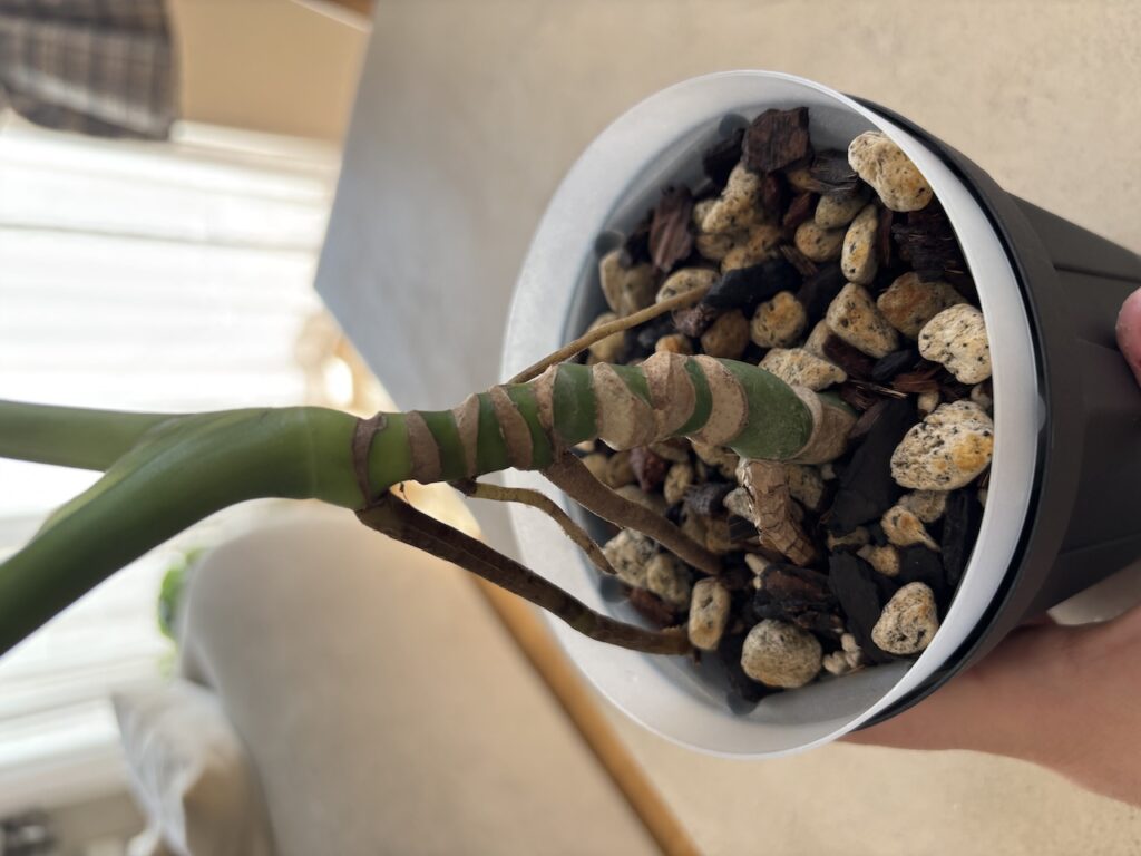 モンステラの根は、比較的太いため乾燥にも耐える力があります。根は渇きを感じて「水」を探して根を伸ばし(張り)ます。しっかりと乾いている時間を作ってあげる事でしっかりとした根鉢が作られます。