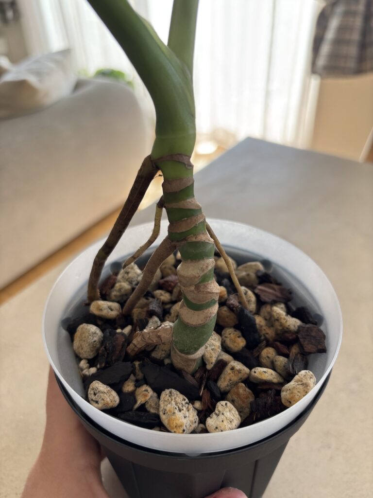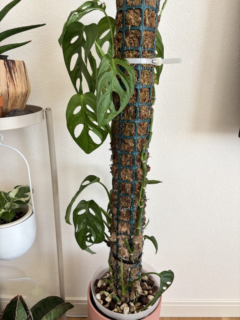 モスポール、ココファイバーポールや木の板でもいいので気根が活着していくと茎が太くなり、葉が大きくなりやすいです。