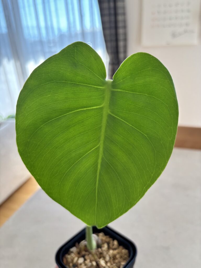 大きな葉っぱをみたい→モスポールや支柱で登らせて幹を太く育てる、有機質を使う。光は一方向。