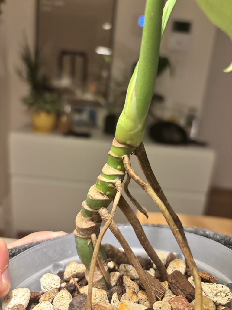 諸説ありますが、鉢を小さくしたり水分を締め気味で育てると新しい栄養を求めて気根が出やすいです。空間湿度が高い場合などもよく出るのでいわゆる植物の「育つぞ〜!」という合図だとでも思うと微笑ましくて可愛いですよね。